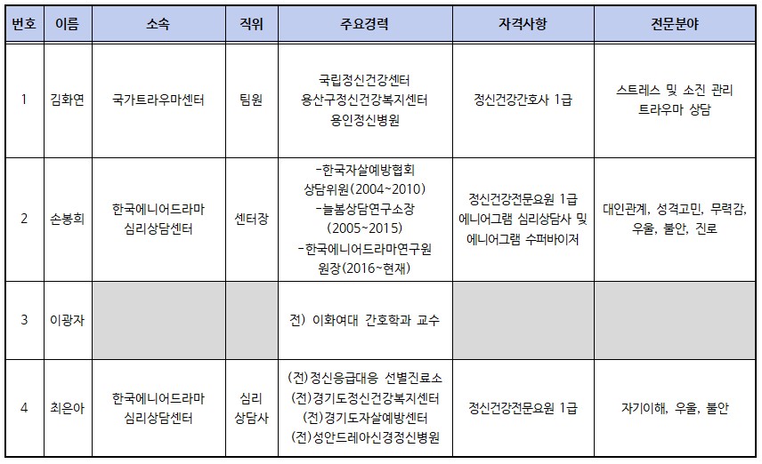 간호현장을 잘 알고 심리 상담 역량과 경험을 갖춘 정신간호전문가를 활용하여 심리상담 기회를 제공하고자 한다.